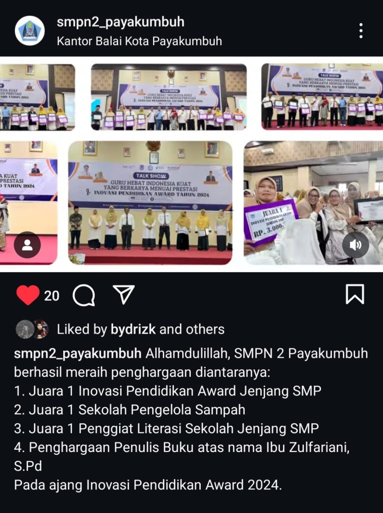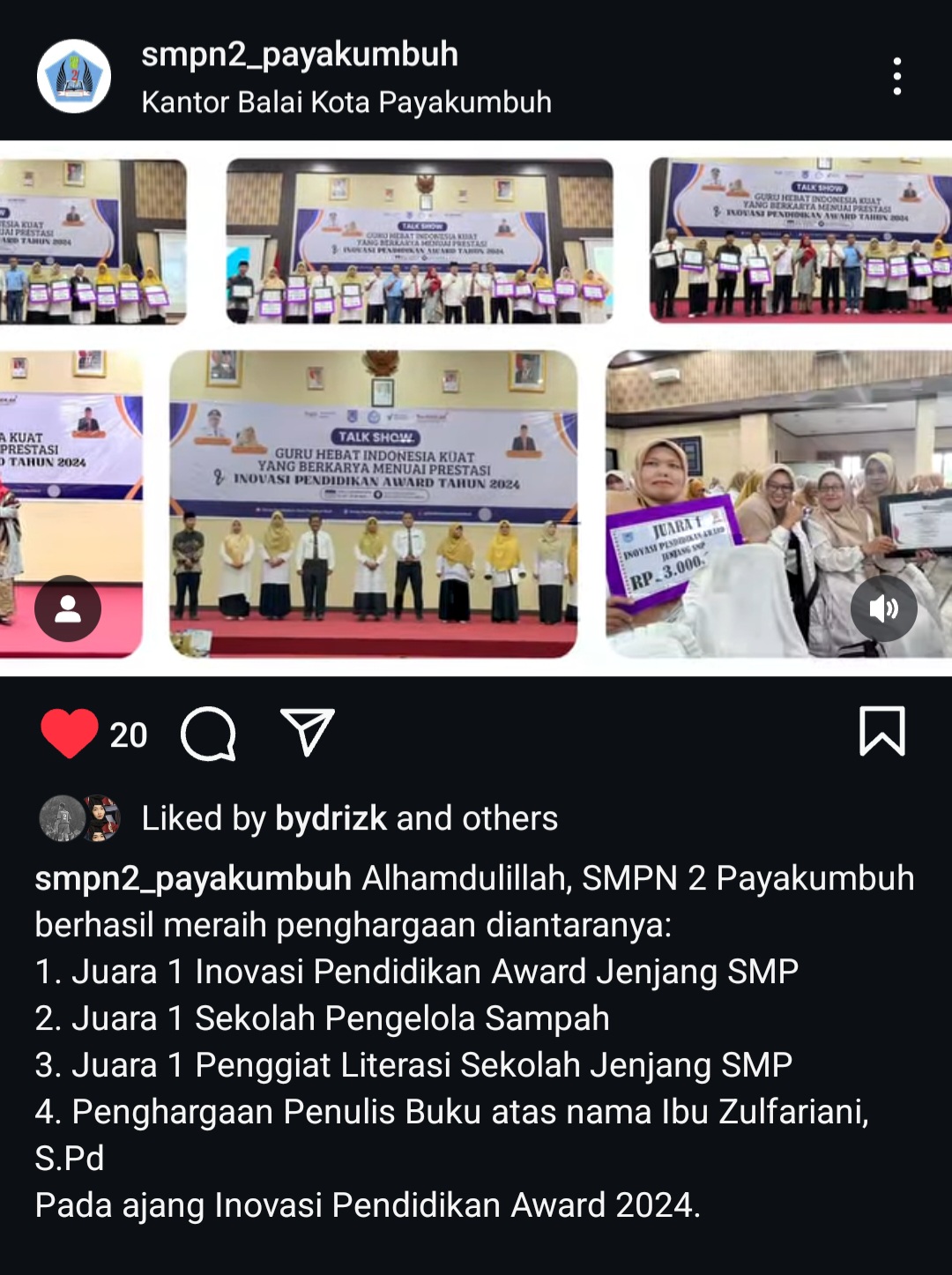 Prestasi Luar biasa SMP 2 Payakumbuh 3 kategori Sebagai Juara 1 Sekolah Inovasi. Bangga sekali